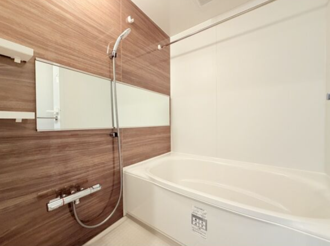 上質な木目調アクセントパネルが印象的な、落ち着きあるバスルーム